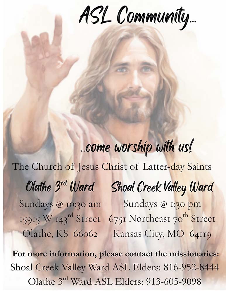 An estimate of only 2%-5% of Deaf people attend church because they don’t have the resources needed. In the Kansas City area, we have two magnet congregations for our Deaf and Hard of Hearing (HH) here at The Church of Jesus Christ of Latter-day Saints! We would love your help to move this work forward and help our ASL missionaries find more Deaf and HH friends. How?